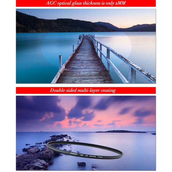 UV lens filter absorbs the ultraviolet rays and can basically eliminate the complex effect of light on the photographic film, which often makes outdoor photographs hazy and indistinct.