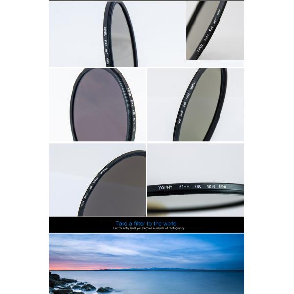 | ND64 | Aluminum alloy+AGC optical glass | 37/40.5/43/46/49/52/55/58 /62/67/72/77/82/86/95/105 | 30g | Black frame thickness is about 5.2mm |