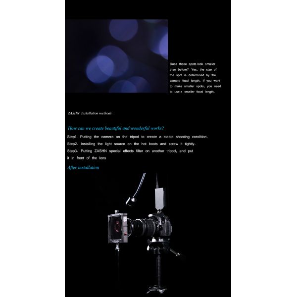 Step 3. Putting ZASHN special effects filter on another tripod, and put it in front of the lens.