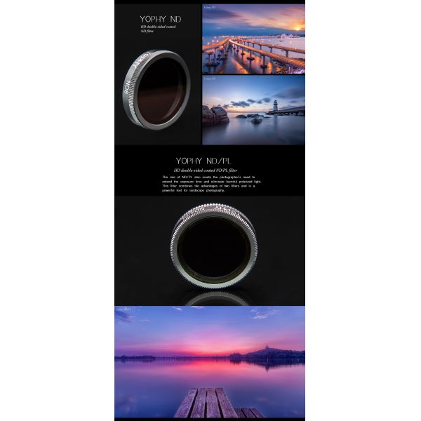 ND/PL: ND/PL filter can ensure the correct exposure, and can obtain the details of the dark part, while increasing the brightness of the color, while removing the interference of polarized lightwhile reducing the light