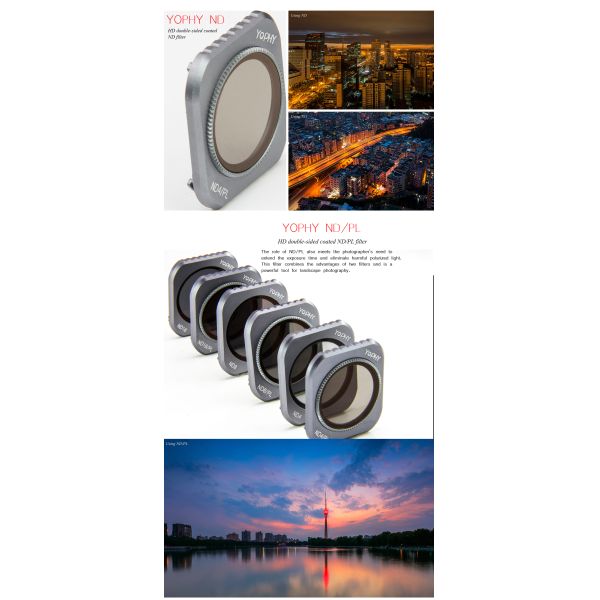 | DJI Mavic2 Zoom 6in1 | ND4,ND8,ND16,ND32,ND64,ND4/PL, ND8/PL,ND16/PL,ND32/PL,ND64/PL | Aviation aluminum alloy+AGC glass | 60g | Thread interface; Grey/black |