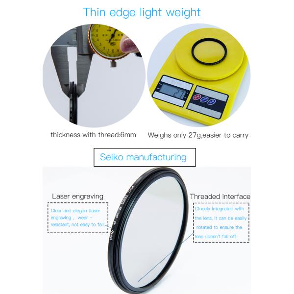 | 6.0 CPL | Aviation aluminum alloy+AGC glass | 37/40.5/43/46/49/52/55/58 /62/67/72/77/82/86/95/105 | 27g | Ultra thin black frame thickness is about 6.0mm |