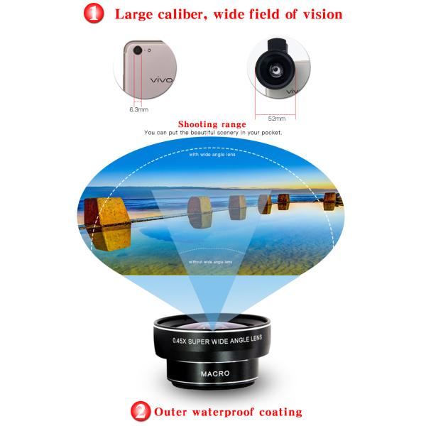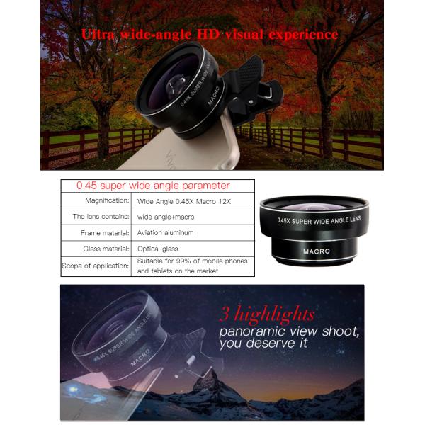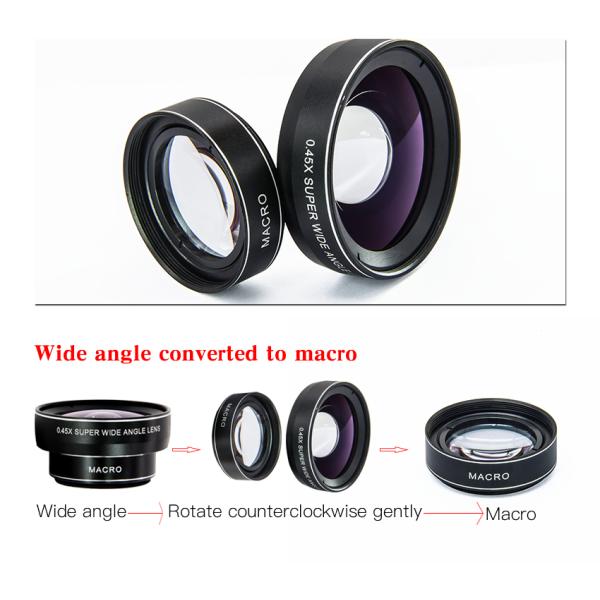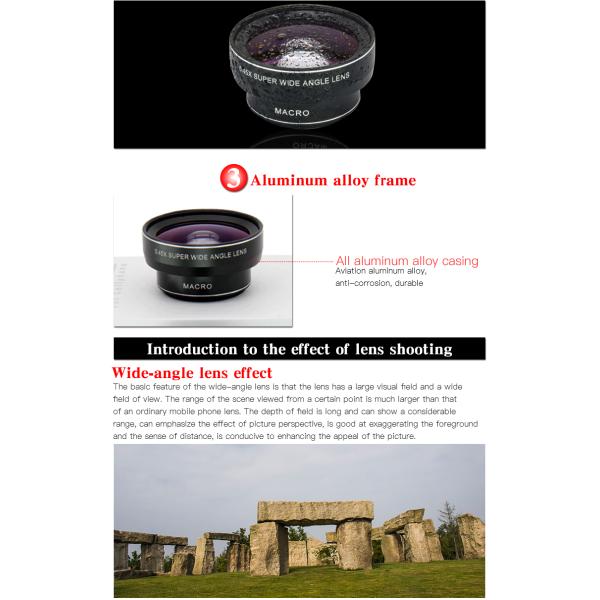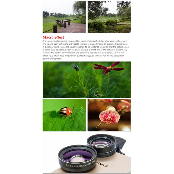 There are lens avaiable: Fisheye, MARCO,AND WIDE ANGLE LENS,MACRO lens can take clear photo of small objects. wide-angle lens can shoot larger range of scenery.180 degrees of the scene can be captured by fisheye lens,which can let you enjoy the unreal world. to use this lens enable you easily enjoy photography and find the instant beauty of the world.