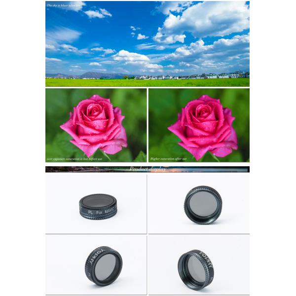 | DJI Mavic2 Pro 6in1 | ND4,ND8,ND16,ND32, ND4/PL,ND8/PL,ND16/PL,ND32/PL | Aviation aluminum alloy+AGC glass | 70g | Thread interface; Grey |